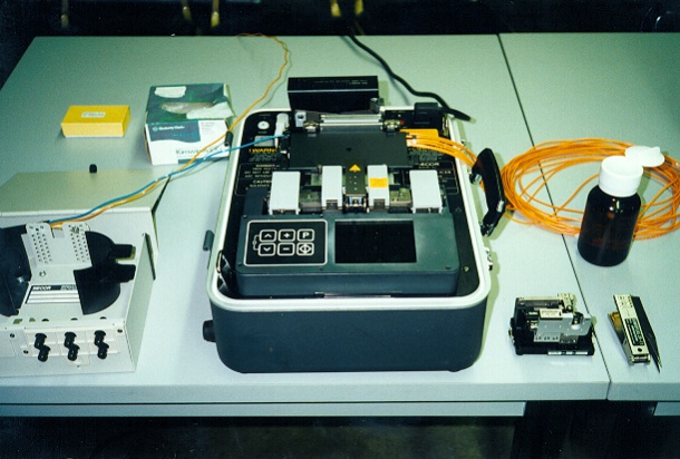 untuk penyambungan kabel fiber optik dibutuhkan alat khusus yang bernama FUSION SPLICER alat ini yang digunakan untuk menyambung dua ujung fiber optic dengan menggunakan panas alat ini butuh ketelitian yang sangat tinggi, alat ini dilengkapi dengan alat pengukur karena setiap ingin menyambung dua sisi FO harus diukur terlebih dahulu dan ukurannya harus sama antara ujung A dan ujung B dan kedua ujung FO harus benar2 bersih (biasanya digunakan alcohol 95% dan tisu untuk membersihkan ujung FO yang sudah dikupas) karena apabila ada kotoran sedikit saja maka FUSION SPLICER tidak akan bisa digunakan alias menolak untuk melakukan penyambungan.